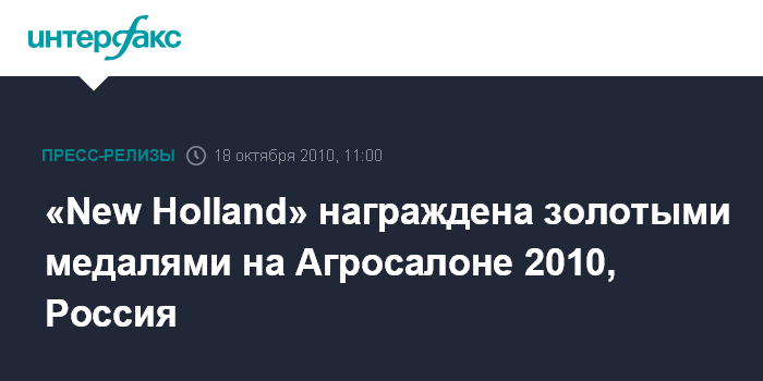 Москва, Россия - (октябрь 18, 2010 г.) - комитет Выставки АГРОСАЛОН 2010, прошедшей с 6 по 9 октября в Международном выставочном центре "Крокус Экспо" в Москве, присудил две золотые награды компании "New Holland Agriculture" за инновации в области техники. АГРОСАЛОН - одна из крупнейших сельскохозяйственных выставок России, на которой представлена продукция ведущих российских и зарубежных производителей сельскохозяйственной техники.