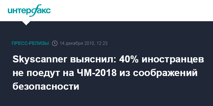 Новость, вызвавшая ликование российских фанатов, была принята не так однозначно за рубежом. В частности, были высказаны опасения о том, что в России иностранные болельщики не будут чувствовать себя в безопасности. Предлагающая дешевые авиабилеты система поиска Skyscanner.ru спросила своих пользователей из европейских стран, собираются ли они в Россию на ЧМ-2018, – и получила не самые воодушевляющие ответы.