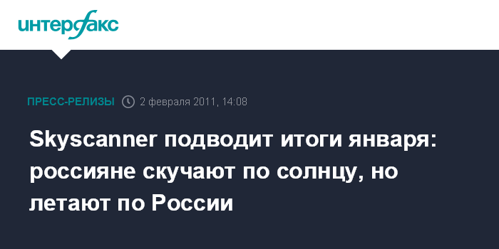 02 февраля - Предлагающая дешевые авиабилеты системы поиска Skyscanner проанализировала статистику запросов за первый месяц 2011 года: российские туристы активнее всего интересовались перелетами внутри страны, в тройке зарубежных лидеров – Италия, Испания и Германия.