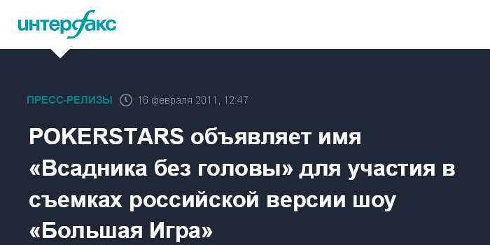 16 февраля - Всадник без головы (Loose Cannon) – игрок, прошедший квалификацию на PokerStars.net – для участия в съемках российской версии «Большой Игры» - наконец определен.