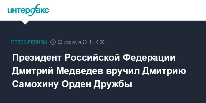 22 февраля - Президент Российской Федерации Дмитрий Медведев вручил председателю совета директоров ОАО "НТВ-ПЛЮС" Дмитрию Самохину Орден Дружбы.