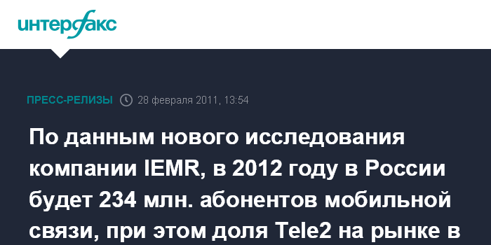 По данным нового исследования компании IEMR, в 2012 году в России будет 234 млн. абонентов мобильной связи, при этом доля Tele2 на рынке в течение двух ближайших лет будет расти