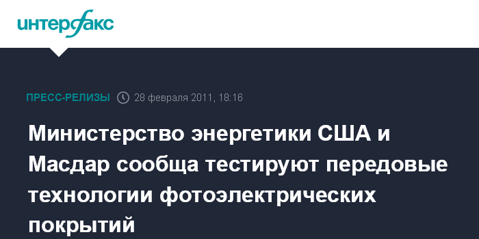 Абу-Даби (ОАЭ) - 28 февраля - BUSINESS WIRE - Министерство энергетики США и многогранная инициатива Абу-Даби в области возобновляемой энергии "Масдар" (Masdar) сообщили о том, что они будут проводить совместное тестирование эффективности солнечных фотоэлектрических модулей со специальным покрытием. Эти модули должны справляться с проблемами влаги и цементации, с которыми в настоящее время сталкиваются производители фотоэлектрических модулей во всем мире, и предотвращать налипание сухой пыли.