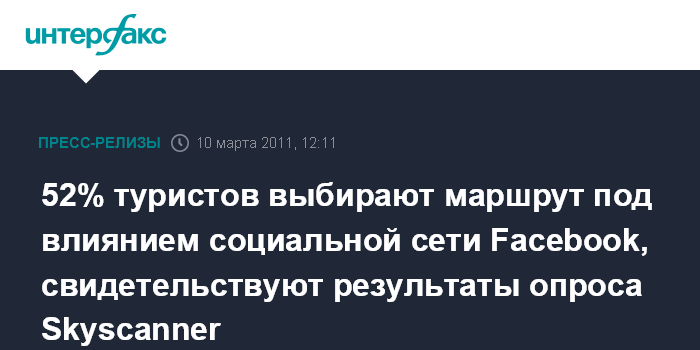 Предлагающая дешевые авиабилетысистема поиска Skyscanner.ru провела международный опрос и выяснила, что 52% пользователей сети Facebook выбирают маршрут путешествия после того, как они увидели фотографии на страницах своих друзей.