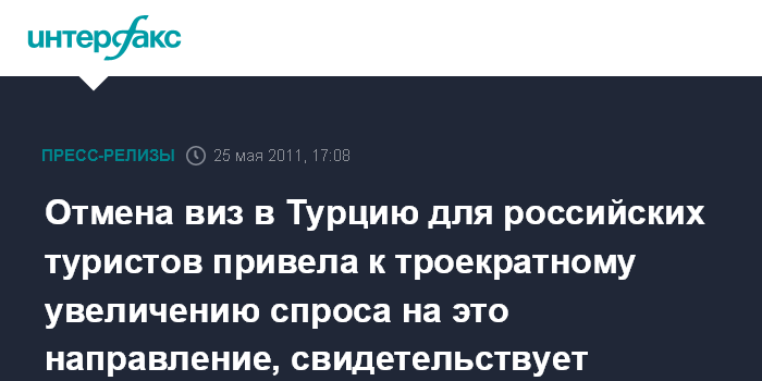Через неделю после изменения визового режима между двумя странами число запросов на авиабилеты в Турцию из России выросло на 86% по сравнению с предыдущей неделей и на 363% по сравнению с тем же периодом 2010 г. Повышенный интерес российских путешественников, самостоятельно бронирующих билеты в эту страну, сохранился и в первой половине мая: в среднем еженедельные показатели этого года превышают прошлогодние в три раза.