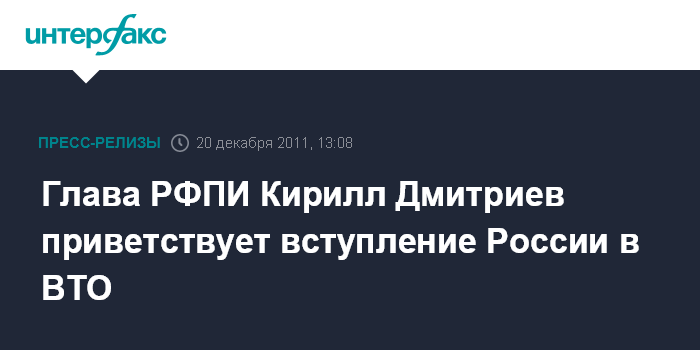 20 декабря - РФПИ, государственный фонд с запланированным капиталом в 10 млрд. долларов, учрежденный для осуществления инвестиций в российскую экономику, приветствует вступление России в ВТО
