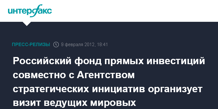 09 февраля — С 14 по 18 февраля Российский фонд прямых инвестиций (РФПИ) и Агентство стратегических инициатив (АСИ) проведут турне для крупнейших международных фондов