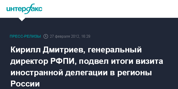 27 февраля, 2012 г. - Кирилл Дмитриев, генеральный директор РФПИ подвел итоги поездки представителей международных фондов по регионам России. Инвесторы посетили 3 города – Ульяновск, Екатеринбург и Красноярск.