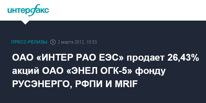 Москва, 1 марта 2012 г. – ОАО «ИНТЕР РАО ЕЭС» достигло договоренности о продаже 26,43% акций ОАО «Энел ОГК-5» консорциуму инвесторов, в который входят «Русэнерго Фонд» компании Xenon Capital Partners, Российский фонд прямых инвестиций и инфраструктурный фонд Macquarie Renaissance.