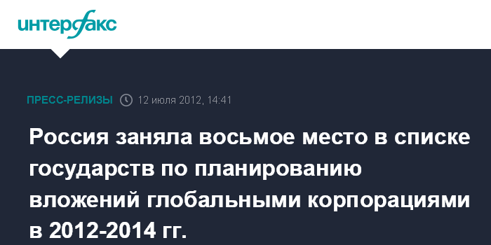 Россия заняла восьмое место в списке государств по планированию вложений глобальными корпорациями в 2012-2014 гг.