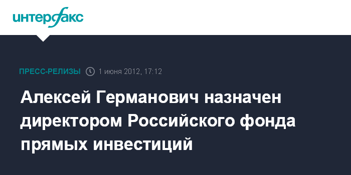 Москва, 1 июня 2012 года -- Алексей Германович возглавит блок корпоративных коммуникаций Российского фонда прямых инвестиций (РФПИ). В его задачи войдет развитие связей со СМИ, инвестиционным, научным и экспертным сообществом, органами государственной власти. В качестве члена правления РФПИ Германович также будет оказывать поддержку команде фонда в сделках в сфере транспорта, инфраструктуры, медиа.