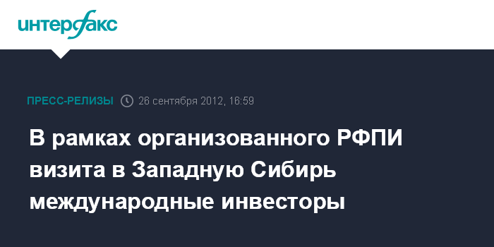 Тобольск, 26 сентября. - Представители ведущих мировых инвестиционных фондов в ходе поездки в Западную Сибирь ознакомились с региональными инвестпроектами в перспективных отраслях экономики. Накануне в рамках выездных мероприятий, организованных Российским фондом прямых инвестиций (РФПИ), инвесторы посетили г. Ханты-Мансийск, где встретились с губернатором Ханты-Мансийского автономного округа Натальей Комаровой. Сегодня в г.Тюмени состоялась встреча группы инвесторов с главой Тюменской области Владимиром Якушевым, на которой также присутствовали представители ОАО «Внешэкономбанк» и ОАО «Сибур». Участникам делегации были презентованы проекты в области создания дорожной и аэропортовой инфраструктуры, производства труб, медицины и мусопереработки.