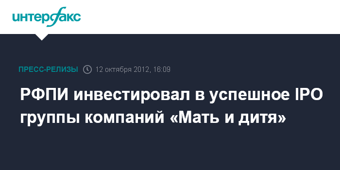 Москва, 12 октября 2012 г. — Российский фонд прямых инвестиций (РФПИ) инвестировал 50 млн долл. США в Группу компаний «Мать и дитя». Кроме того, фонд привлек в IPO в качестве соинвесторов крупнейшую в мире инвестиционную компанию BlackRock (через фонд BlackRock Investment Management (UK) Limited); Russia Partners, дочернее предприятие компании Siguler Guff и один из крупнейших российских фондов прямых инвестиций; а также ряд других ведущих институциональных инвесторов.