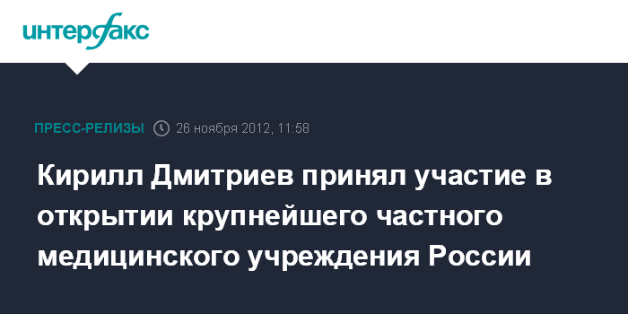 Москва, 26 ноября 2012 г. – Генеральный директор Российского фонда прямых инвестиций (РФПИ) Кирилл Дмитриев принял участие в церемонии официального открытия Клинического госпиталя Лапино - крупнейшего частного медицинского учреждения в стране.