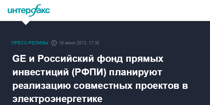 МОСКВА, Россия – 18 июня 2013 г. – Компания General Electric (NYSE:GE) и Российский фонд прямых инвестиций (РФПИ) планируют подписать Меморандум о взаимопонимании о создании совместного предприятия (СП) с целью строительства объектов малой генерации для промышленных предприятий в различных регионах России. Церемония подписания состоится 21 июня 2013г на Петербургском международном экономическом форуме. Со стороны компаний подписи под документом поставят Президент и Главный исполнительный директор GE в России и СНГ Рон Поллетт и Директор РФПИ Шон Глодек. Мероприятие пройдет в присутствии Председателя и Главного исполнительного директора GE Джеффа Иммельта и Генерального директора РФПИ Кирилла Дмитриева.