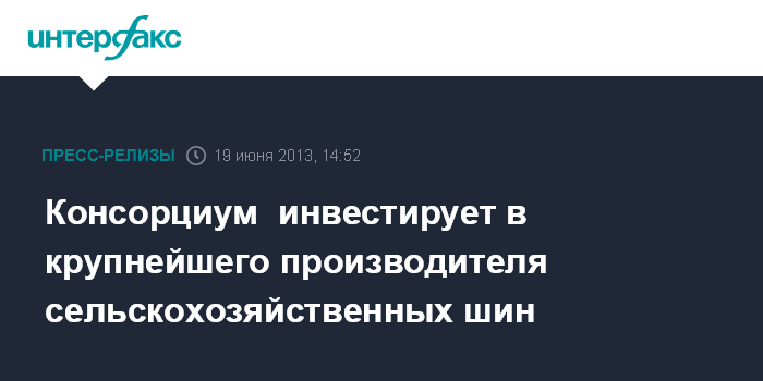 Москва, 19 июня 2013 г. – Консорциум, в состав которого входят Российский Фонд Прямых Инвестиций (РФПИ), мировой лидер в производстве шин для сельхозтехники Titan International и фонд One Equity Partners, инвестиционная структура одного из крупнейших банков мира J.P.Morgan, достигли принципиальной договоренности с холдингом «Кордиант» об инвестициях Консорциума в ОАО «Волтайр-Пром» - ведущего российского производителя шин для сельскохозяйственной и индустриальной техники. Стороны намерены финализировать сделку в ближайшее время.
