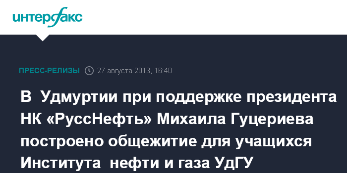 В Удмуртии при поддержке президента НК «РуссНефть» Михаила Гуцериева построено общежитие для учащихся Института нефти и газа УдГУ