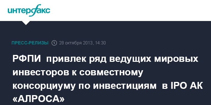 Москва, 28 октября, 2013 – Российский фонд прямых инвестиций (РФПИ) привлек ряд ведущих мировых инвесторов из Северной Америки, Ближнего Востока, Западной и Северной Европы и Юго-Восточной Азии к совместному консорциуму по инвестициям в IPO АК «АЛРОСА», российской алмазодобывающей компании. Участие консорциума способствовало успешному IPO компании, которая в совокупности была оценена рынком в 257,7 млрд руб.