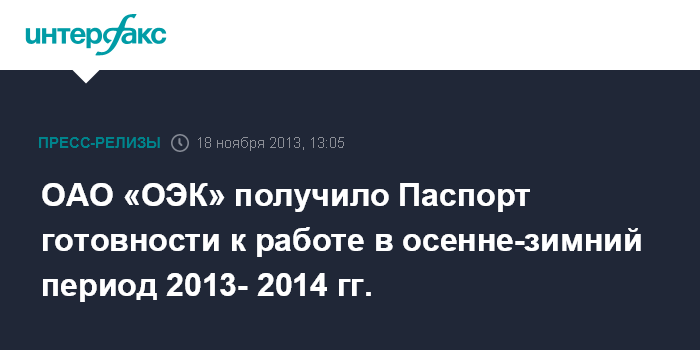 ОАО «Объединенная энергетическая компания» получило Паспорт готовности к работе в осенне-зимний период 2013-2014 годов.