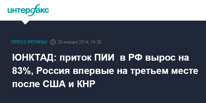 Москва, 29 января 2014 г. – Global Investment Trends Monitor), в котором говорится, что за минувший год в Российскую Федерацию поступили прямые иностранные инвестиции (ПИИ) на рекордную сумму в $94 млрд. Это на 83% выше аналогичного показателя за 2012 год. Таким образом, Россия впервые заняла третью строчку рейтинга стран по объему привлеченных ПИИ по версии ЮНКТАД, уступив лишь США и КНР.