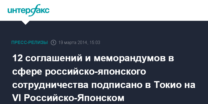 19 марта 2014 в Токио открылся VI Российско-Японский инвестиционный Форум, организованный Министерством экономического развития России совместно с Министерством экономики, торговли и промышленности Японии, при участии Министерства сельского хозяйства РФ, при поддержке Петербургского международного экономического форума (ПМЭФ) и общероссийской общественной организации "Деловая Россия".