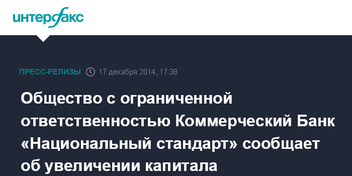 Общество с ограниченной ответственностью Коммерческий Банк «Национальный стандарт» сообщает об увеличении капитала