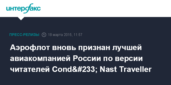 18 марта 2015 года, Москва. – Аэрофлот в третий раз подряд признан лучшей российской авиакомпанией по версии самой авторитетной премии в сфере туризма – «Выбор читателей Condé Nast Traveller».