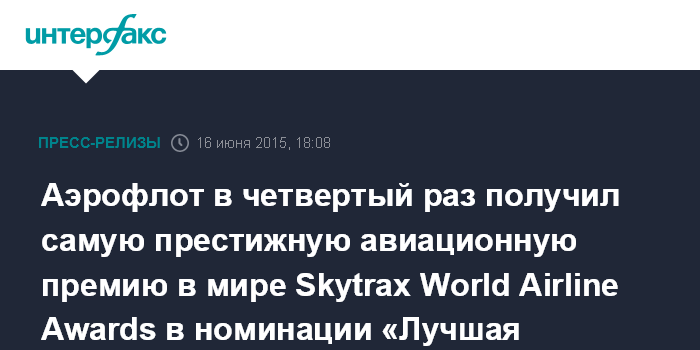16 июня 2015 года, Москва. – Аэрофлот вновь награжден международной премией Skytrax World Airline Awards в номинации «Лучшая авиакомпания Восточной Европы».