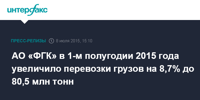 По итогам производственной деятельности за 1-е полугодие 2015 года общий объем перевезенных АО «ФГК» грузов составил 80,5 млн тонн (на 8,7% больше, чем в аналогичном периоде 2014 года), или 1,25 млн вагоноотправок.