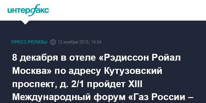 8 декабря в отеле «Рэдиссон Ройал Москва» по адресу Кутузовский проспект, д. 2/1 пройдет XIII Международный форум «Газ России – 2015»