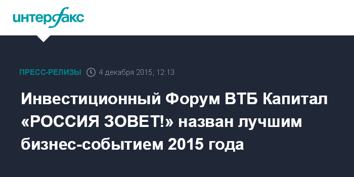 Инвестиционный Форум ВТБ Капитал «РОССИЯ ЗОВЕТ!» назван «Бизнес-событием года». Форум получил премию The Moscow Times Awards 2015.