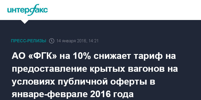 В январе – феврале 2016 года АО «ФГК» на 10% снижает тарифы на предоставление крытых вагонов в рамках услуги ФГК-Экспресс (предоставление вагонов на условиях публичной оферты) на все виды перевозимых грузов.