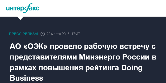 В АО «Объединенная энергетическая компания» состоялась рабочая встреча с представителями Министерства энергетики Российской Федерации. Встреча прошла в рамках продвижения России в топ-20 рейтинга Всемирного банка «Ведение бизнеса» (Doing Business) в 2016 году по направлению «Подключение к электрическим сетям».