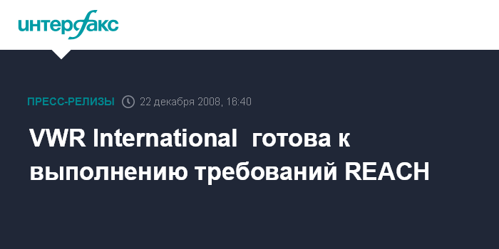 Дармштадт (Германия). 19 декабря BUSINESS WIRE – Компания VWR International, которая является дочерней структурой VWR International, LLC, объявила сегодня о завершении предварительной регистрации нашего портфеля в соответствии с требованиями директивы REACH (Registration, Evaluation, Authorization and Restriction of Chemicals - Регистрация, оценка, разрешение и ограничение химических веществ). VWR является ведущим глобальным поставщиком лабораторной продукции и представлена в 16 европейских странах.