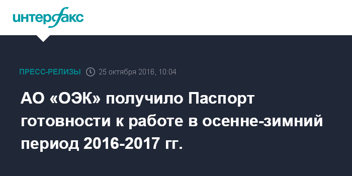 АО «ОЭК» получило Паспорт готовности к работе в осенне-зимний период 2016-2017 гг.