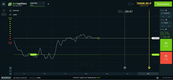 Компания DotOption предлагает выгодные условия работы, вы сможете получать выигрыш в размере до 85% от суммы сделки. Нет спредов и комиссий, возможна торговля более чем 40 валютными парами и драгметаллами. Минимальная сумма для открытия торгового счета составляет всего 500 рублей. Размер минимальной ставки – 30 рублей. Действует бонусная программа с начислением до 100% от суммы внесенных средств. Торговый счет можно мгновенно пополнять с банковской карты или с использованием популярных платежных систем. Вывод заработанных средств занимает от 1 до 3 дней.