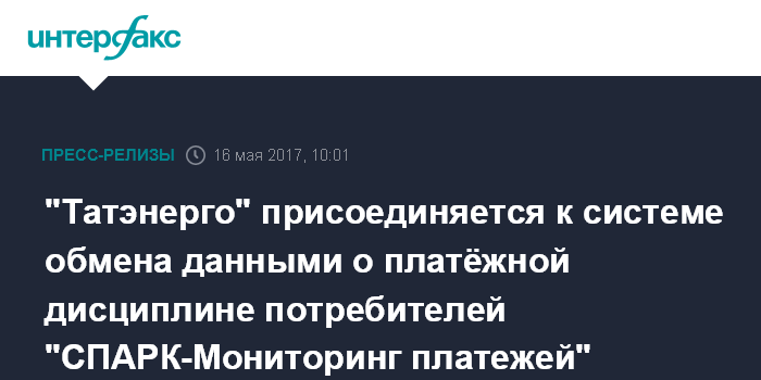 В целях снижения просроченных обязательств за услуги ЖКХ со стороны промышленных потребителей, а также дисциплинирования пользователей данных услуг, стимулирования их к своевременной оплате в мае 2017 года АО "Татэнерго" начинает также обмен данными о платёжной дисциплине потребителей энергоресурсов через систему "СПАРК-Мониторинг платежей". Этот ресурс позволит "Татэнерго" проводить более полный анализ практики исполнения договорных обязательств контрагентами в режиме реального времени по всем обязательствам клиента во всех отраслях и уже на основании этих данных принимать решение о применении необходимых мер воздействия, вплоть до судебного разбирательства и возбуждения процедуры банкротства.