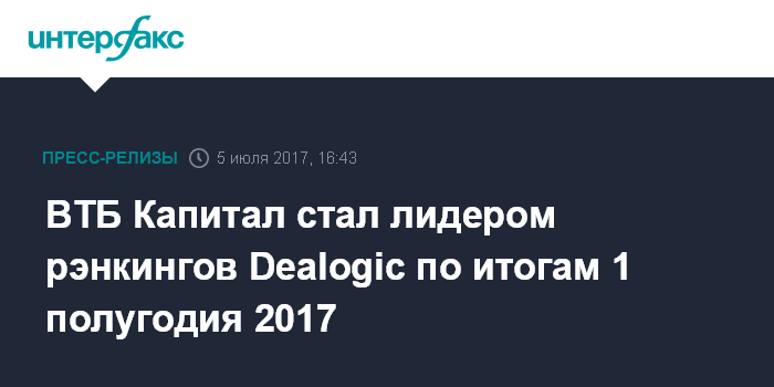 ВТБ Капитал стал лидером рэнкингов Dealogic по итогам 1 полугодия 2017