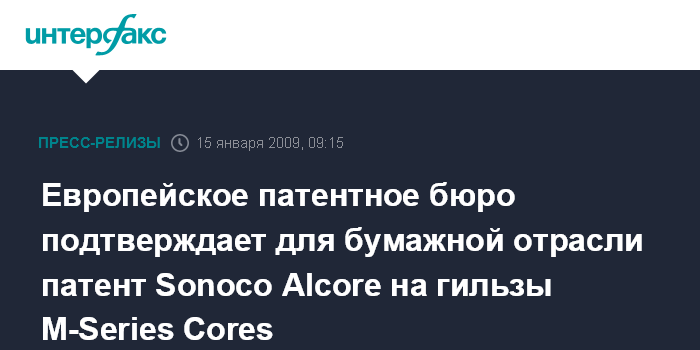 BUSINESS WIRE – Sonoco Alcore S.a.r.l. – стопроцентная дочерняя структура одной из крупнейших диверсифицированных глобальных компаний в сфере упаковки Sonoco (NYSE: SON) – объявила, что отдел протестов Европейского патентного ведомства вновь поддержал европейский патент ЕР 1 071 556 на использование технологии широкослойного картона в производстве гильз M-Series Cores для бумажной промышленности. Это решение может быт обжаловано.