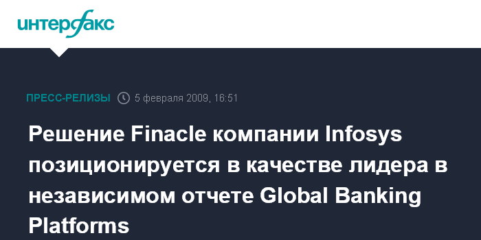 Бангалор (Индия) и Лондон (Великобритания). 4 февраля BUSINESS WIRE - Компания Infosys Technologies объявила о том, что ее решение Finacle от Infosys было названо лидером в январском отчете 2009 года "The Forrester Wave: Global Banking Platforms, Q1 2009". Решение Finacle получило наибвысшие оценки по таким критериям, как текущее предложение, корпоративная стратегия и стратегия развития программных продуктов. С детальным отчетом можно ознакомиться по адресу http://www.infosys.com/finacle/solutions/global-banking-platform.asp.