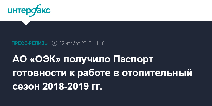 Правилами оценки готовности были введены уровни готовности на основе расчета разработанного индекса («готов» - 1, «готов с условиями» - 1 - 0,95, «не готов» - менее 0,95). По итогам подготовки к работе в период отопительного сезона АО «ОЭК» Минэнерго России выдан «Паспорт готовности к работе в отопительный сезон 2018/19 года» с индексом готовности 1 - «готов».