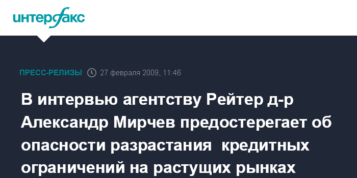 В интервью агентству Рейтер д-р Александр Мирчев, известный международный эксперт в сфере экономического развития и глобальной стратегии, предостерегает об опасности разрастания кредитных ограничений на растущих рынках