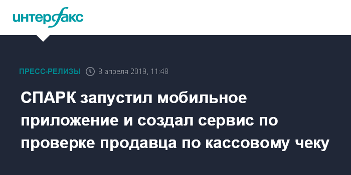 Москва. 8 апреля. INTERFAX.RU - Группа "Интерфакс" объявила о запуске мобильного приложения системы СПАРК и оперативного сервиса по проверке продавца по кассовому чеку.
