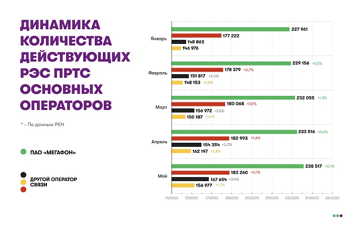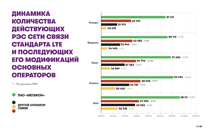 Москва. 3 июля, 2019 г. Всероссийский оператор цифровых возможностей МегаФон лидирует по числу базовых станций в России по данным Роскомнадзора по результатам 5 месяцев 2019 года. Всего у оператора более 238,52 тысяч базовых станций, при этом общее число базовых станций стандарта LTE (4G) составляет 98,1 тысяч, что значительно превышает аналогичные показатели конкурентов. Сегодня сеть МегаФона с самым быстрым мобильным интернетом LTE/4G доступна клиентам в 83 российских регионах.