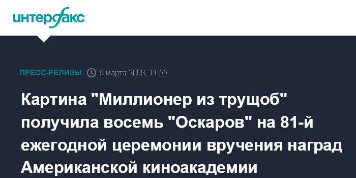 BUSINESS WIRE - На 81-й ежегодной церемонии вручения наград Американской киноакадемии картина "Миллионер из трущоб" получила восемь "Оскаров", в том числе за лучший фильм