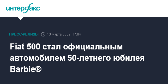 Милан (Италия). 12 марта BUSINESS WIRE – Знаменитая во всем мире своими неверо-ятными аксессуарами компания Mattel объявила сегодня об официальном автомобиле 50-летнего юбилея Barbie®, которым стал Fiat 500. Fiat 500, снискавший во всем мире признание совершенным итальянским дизайном и абсолютным гламуром и завоевавший репутацию суперстильного и необыкновенного автомобиля, будет по-своему представлять куклу Barbie® в исключительном для нее году.