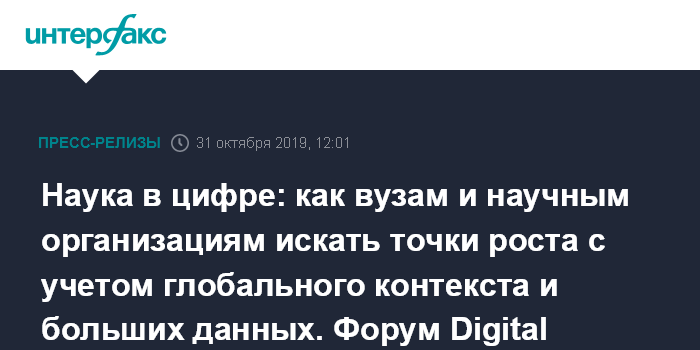 Третий ежегодный форум «Цифровая наука — мировые тренды и "большие данные" в российском контексте» пройдёт 31 октября 2019 в Москве на площадке Swissôtel Красные холмы. Организатором выступает компания Digital Science Россия и СНГ при поддержке Минобрнауки РФ, РНФ и Проектного офиса 5-100. На примере ведущих научно-образовательных организаций России и мира — ЦЕРНа, Сколтеха, питерского Политеха, Томского госуниверситета и др., — и международных игроков — глобальной группы Merck, Цифрового офиса Ассоциации Гельмгольца, Японского агентства инноваций — участники обсудят, как цифровые инструменты помогают принимать быстрые и качественные управленческие решения и ускоряют развитие мировой науки.