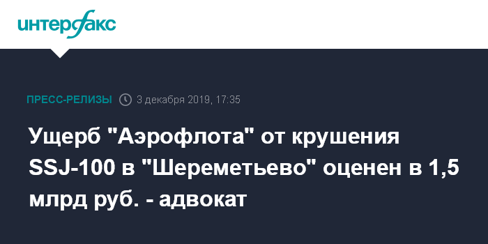Ущерб "Аэрофлота" от крушения SSJ-100 в "Шереметьево" оценен в 1,5 млрд руб. - адвокат