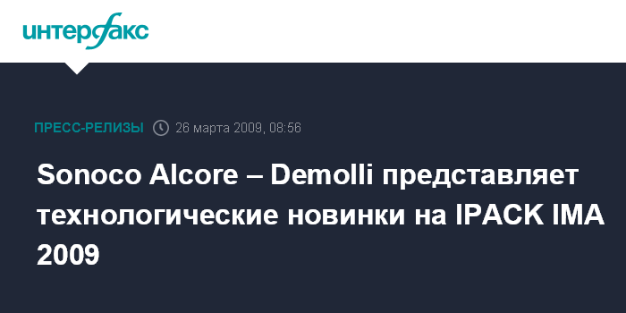 Милан (Италия). 24 марта BUSINESS WIRE – Sonoco Alcore – Demolli S.R.L. – стопро-центная дочерняя структура Sonoco (NYSE: SON), одной из крупнейших диверсифицирован-ных глобальных компаний в сфере упаковки – запускает на выставке технологий обработки, производства и упаковки пищевых продуктов IPACK IMA, которая проходит 24-28 марта 2009 года, ряд новых продуктов.