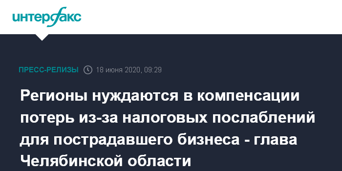 Регионы нуждаются в компенсации потерь из-за налоговых послаблений для пострадавшего бизнеса - глава Челябинской области